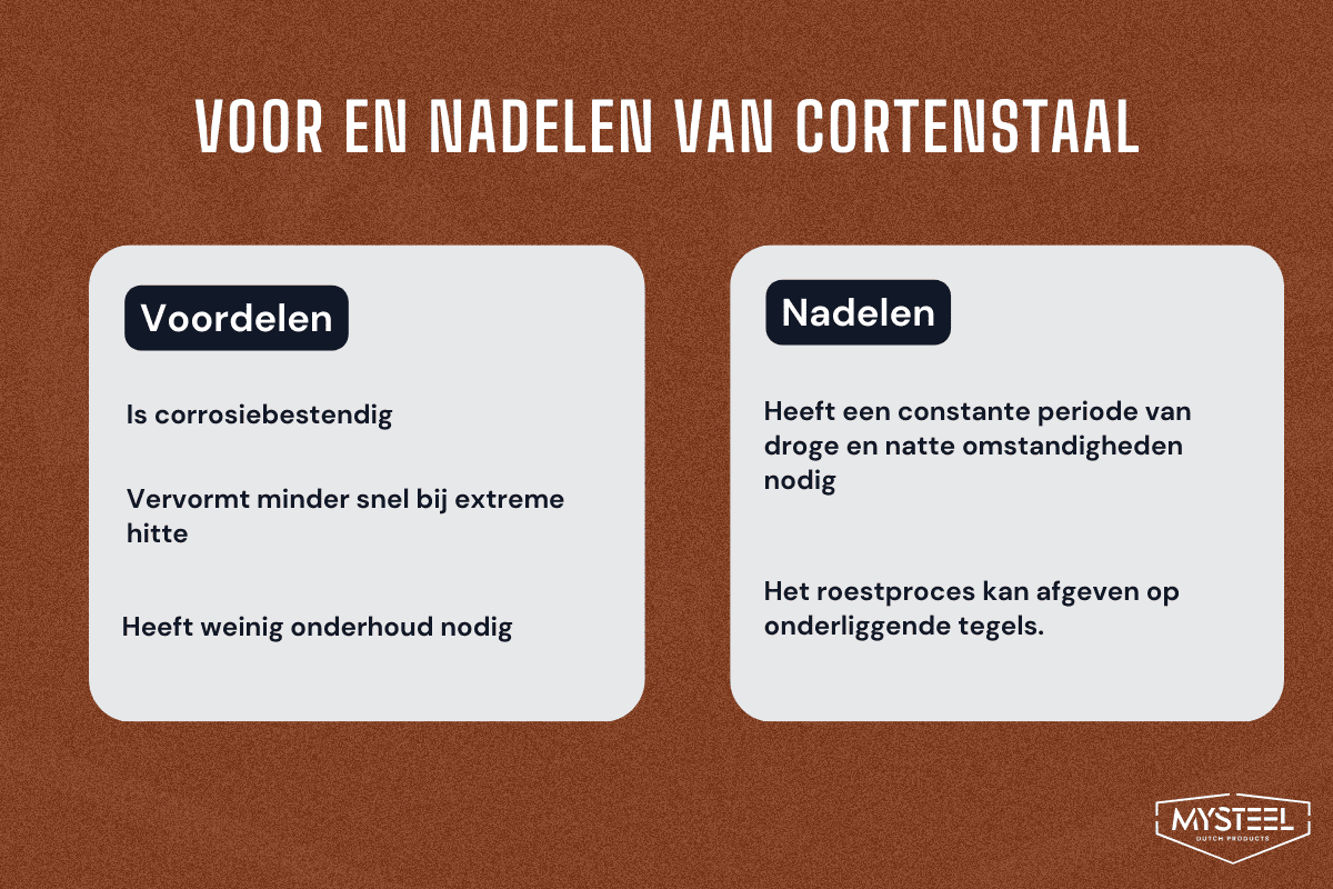 Een ander klein nadeel is dat cortenstaal in het begin van het roestproces kan afgeven op bijvoorbeeld onderliggende tegels.