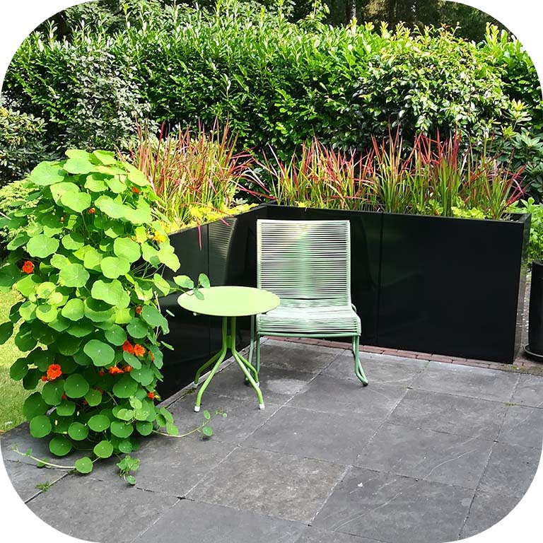 Lors de l'aménagement d'un petit jardin urbain , il est très important d'utiliser l'espace de manière intelligente. Utilisez des plates-bandes surélevées le long des bordures pour tirer le meilleur parti de l'espace disponible. Les bordures en acier, les murs de soutènement et les surplombs en acier Corten permettent de créer des limites claires entre les différentes parties de votre jardin. Cela donne une structure et garantit que tout reste bien en place. Vous pouvez également ajouter des lignes courbes ou des différences de hauteur pour plus de profondeur et un effet ludique.
