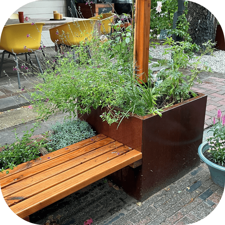 Dans un petit jardin, il est utile que les meubles aient plus d'une fonction. Choisissez par exemple des jardinières en acier Corten avec un banc en bois Douglas intégré.