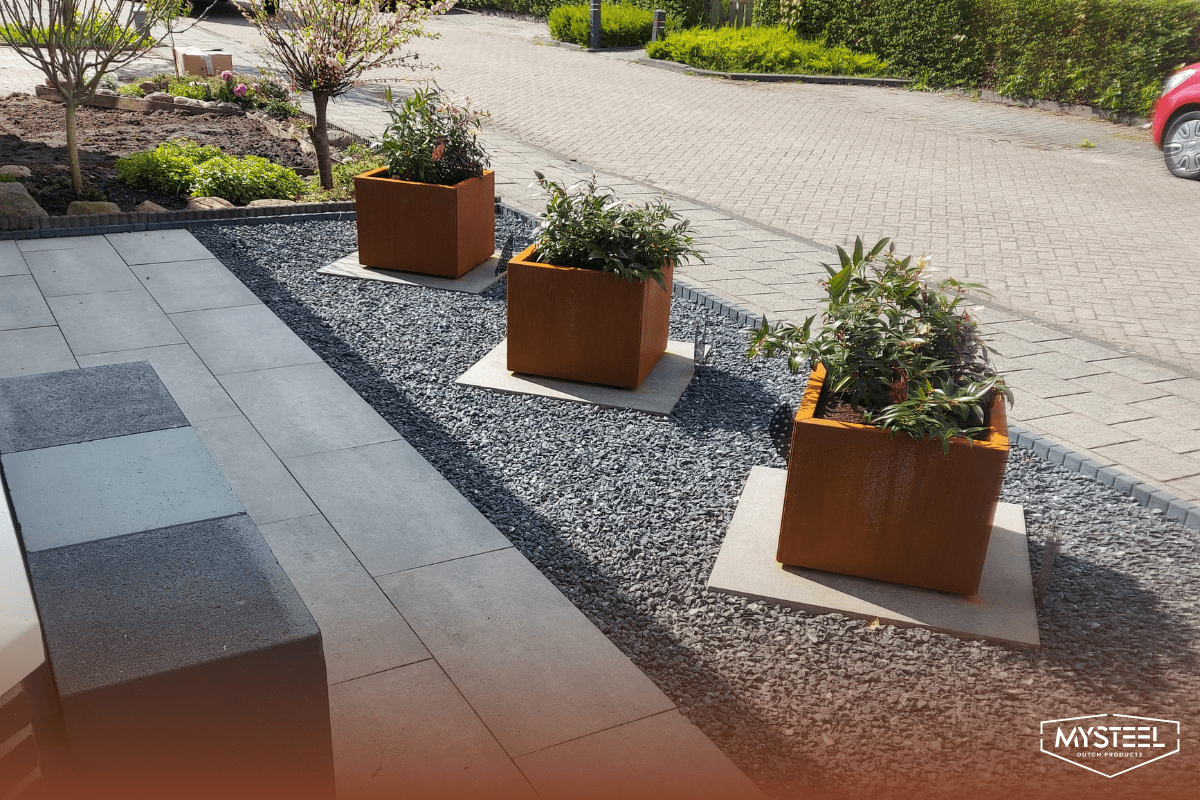 Jardin de devant avec d'autres produits de jardin en acier corten