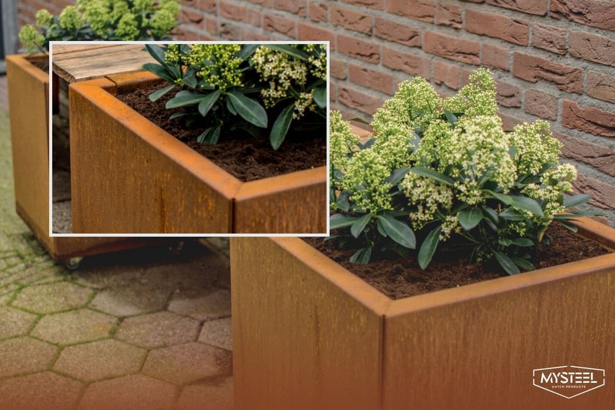 De nombreux conteneurs de jardin potager sont fabriqués en bois traité chimiquement. Ce n'est pas l'idéal pour la culture d'aliments. Une jardinière en acier Corten est plus sûre : elle ne contient pas de substances nocives qui peuvent se dégager et arrêter la croissance. La couche de rouille qui se forme n'est pas toxique et n'affecte pas les plantes.