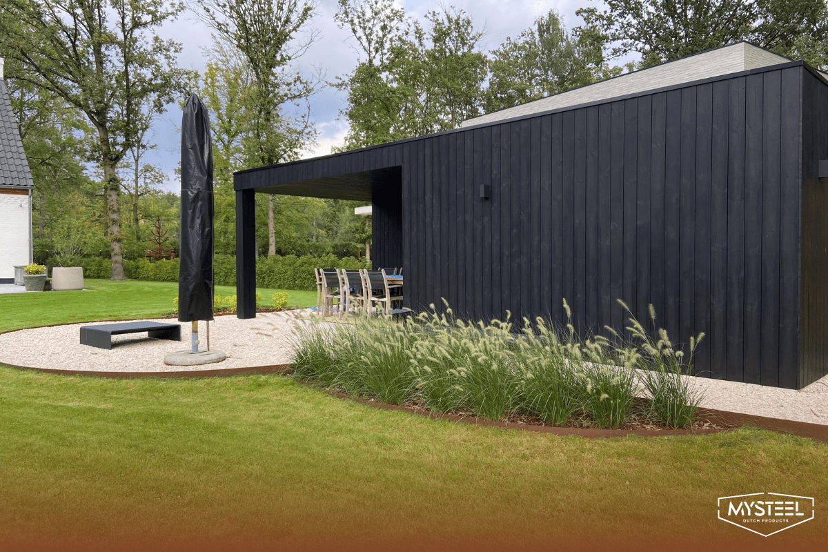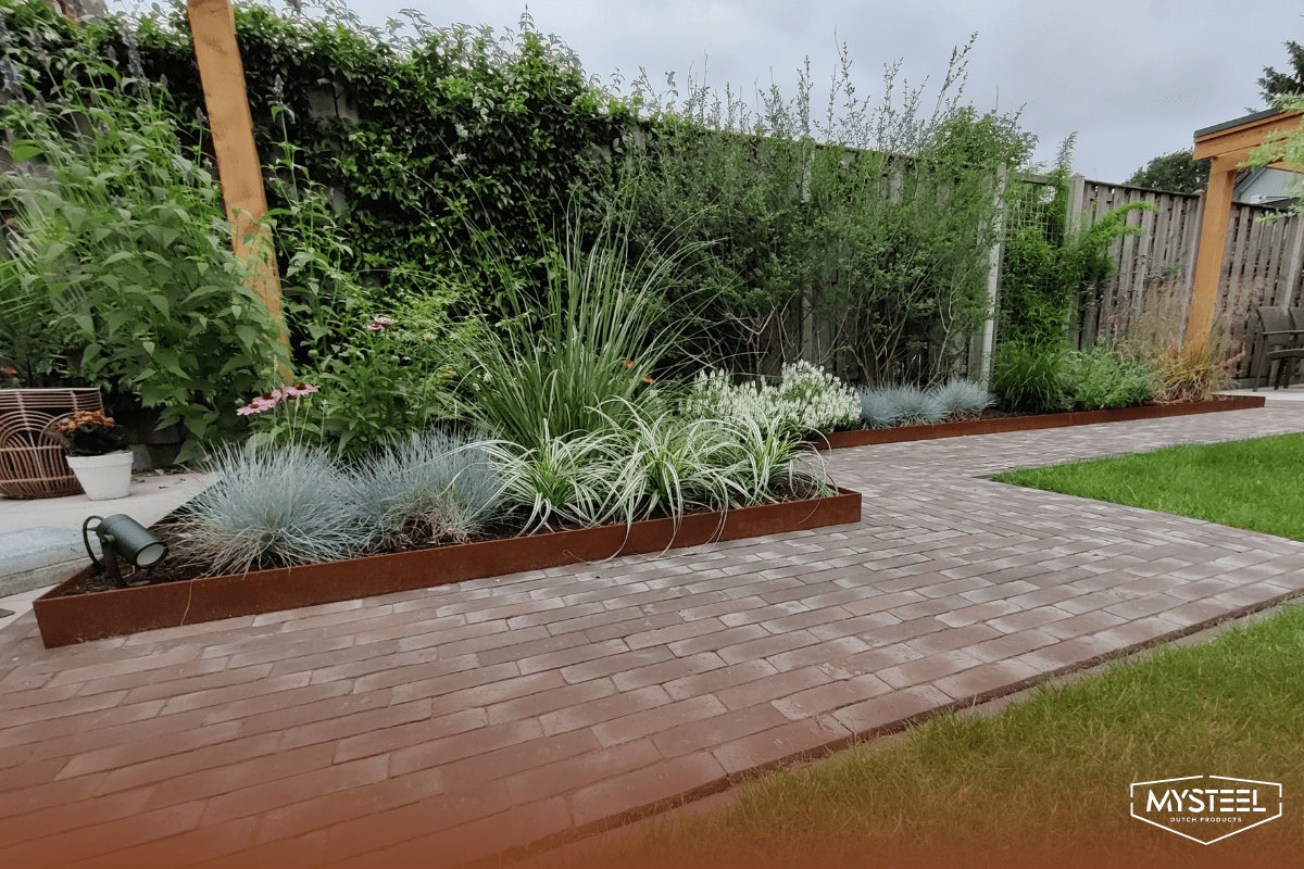 Les bordures permettent de définir et d'accentuer les différentes zones du jardin. Elles fournissent des limites claires et soulignent la démarcation des différentes zones de votre jardin. Dans l'image ci-dessous, la bordure en acier corten est également combinée avec le bac à plantes en acier corten.