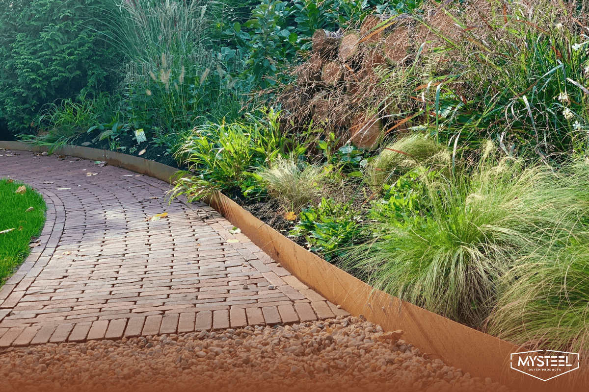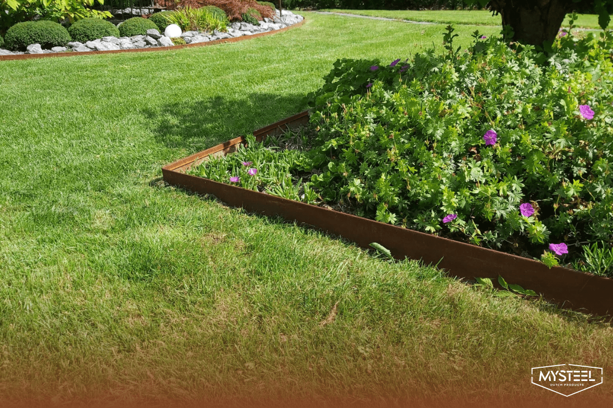 - Bords de contenance en acier Corten. Ce matériau est très apprécié en raison de son aspect rouillé naturel. Après un certain temps, l'acier corten développe une belle patine qui confère au jardin un charme rustique.