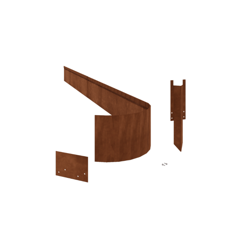 Ces bordures sont fabriquées en tôle d'acier Corten-A de haute qualité. Ce type de métal a la propriété unique de former une peau d'oxyde très dense (couche de rouille). La rouille est donc impossible à traverser. La couche d'oxyde dense protège le matériau en profondeur de l'oxygène, ce qui ralentit considérablement l'oxydation, tandis que la corrosion se poursuit. La bordure est livrée non traitée, dans la couleur gris métallisé. Le processus de rouille commence dans les deux premiers mois ; aucun traitement n'est nécessaire. Pendant le processus de rouille, la bordure peut se décoller. L'acier Corten est un alliage métallique composé de fer auquel ont été ajoutés du cuivre, du phosphore, du silicium, du nickel et du chrome.