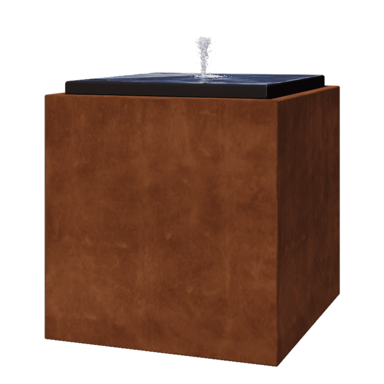 L'ornement d'eau est livré avec une pompe assortie et un cordon. La pompe située à l'intérieur de la vasque fait monter l'eau. L'eau s'écoule ensuite sur la plaque intérieure, avant de retomber dans le bassin. Il est nécessaire de changer l'eau d'un ornement en acier Corten pendant les premiers mois, jusqu'à ce que la rouille soit complète. En cas de gel, la pompe doit être arrêtée. En option, vous pouvez opter pour un éclairage LED.